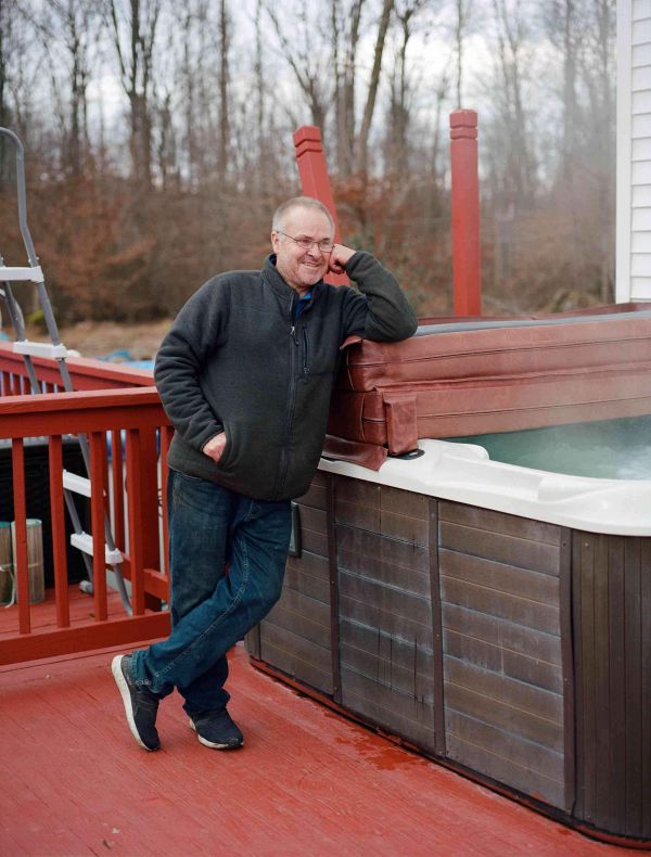 迈克·斯特里斯基靠在家里一个用氢气加热的浴池边|图片来自《纽约时报》|摄影Kat Slootsky