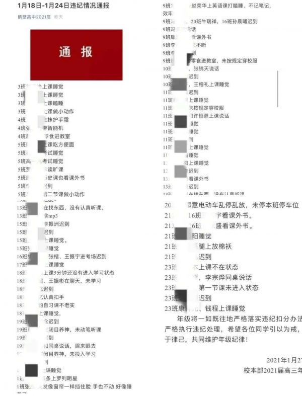 1月27日,名为“鹤壁高中2021届”的微信公众号发布文章《1月18日-1月24日违纪情况通报》,迅速引发关注。“河南鹤壁高中实名通报学生课堂违纪”的微博话题引起了六十多万讨论,有人“为腿上放棉袄的同学伸冤”,有人评价“现在小孩读书就像服刑一样”,也有人指出“违纪通报本身并没有什么问题,但最好局限在校内”,甚至有人提议“也给领导办公室装监控,上班玩手机的一律通报”。