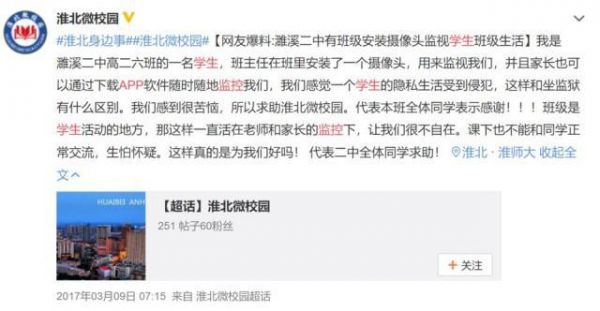 再往前,2017年,有学生在社交平台爆料,“班主任在班里装了一个摄像头,用来监视我们,家长也可以下载APP随时监控我们。班级是学生活动的地方,这样一直活在老师和家长的监控下,让我们很不自在。课下也不能和同学正常交流,生怕被怀疑。这样真的是为我们好吗?”