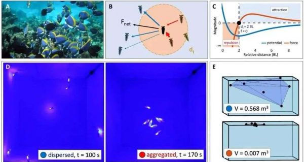 随后,利用简单的视觉观测结果和简单的相互作用规则,这些机器鱼们就能聚集群,呈现出复杂的自组织行为。