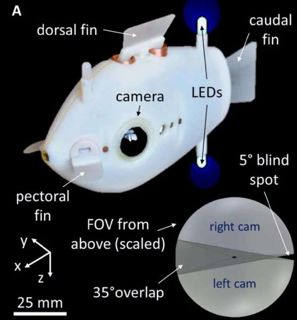 而LED灯用于显示机器鱼的位置,这个设计是受到发光生物和鱼类独特条纹的启发,它发出的蓝光也解释了机器鱼“Bluebot”之名的来源。