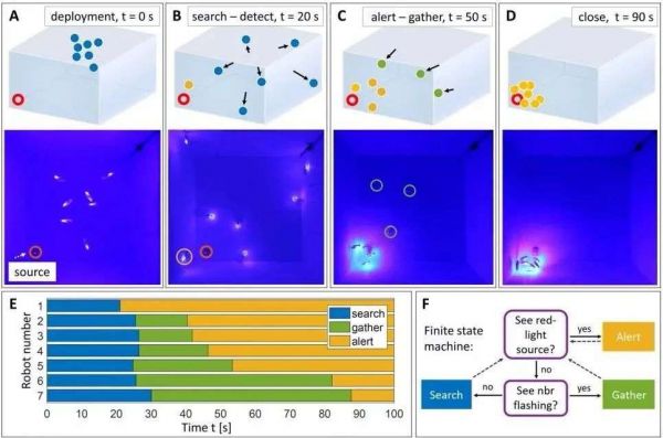 随后,研究人员还展示了如何通过序列方式获得更为复杂的行为模式。例如,将Bluebot们放置在未知的红光源附近,通过不断切换搜索、警报和聚集行为来定位光源位置。