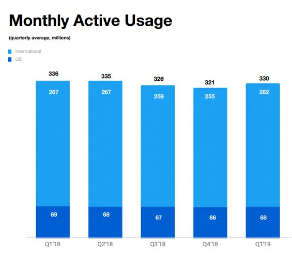 一季度,推特月活人数(Average monthly active users)为3.3亿,比去年同期的3.36亿略有下降,但比上季度的3.21亿有所提高。