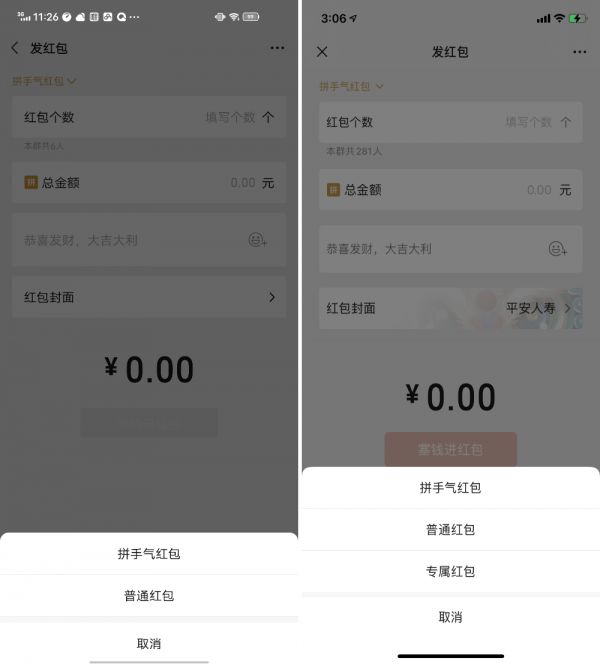 被灰测到的用户能看到拼手气红包、普通红包、专属红包三个选项,没有被灰测到的用户仍只能看到拼手气红包、普通红包两个选项。