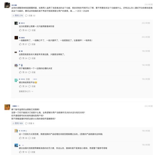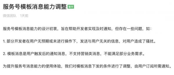所谓物极必反,盛极必衰。随着微信平台影响力的扩大,越来越多的开发者加入到了微信生态中试图分一杯羹,这其中不乏头脑发热,游走在规则边缘的极端分子,即便是强如微信这样的国民级平台,也不可能做到 100% 监管到位,无端骚扰用户甚至侵害用户人身财产安全的事件日益增多。近两年微信团队也多次就服务号违规运营和模板消息能力的权限问题做出了整改和调整,但这些调整所带来的影响远没有 1 月 27 日的公告来的迅猛且深远。