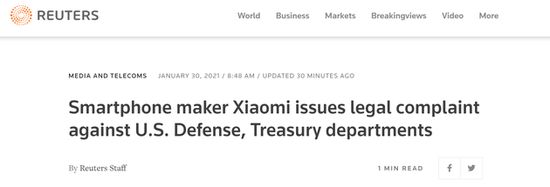 新浪科技讯 1月30日上午消息,据路透社30日消息,根据公开的法庭记录,中国智能手机制造商小米公司当地时间1月29日对美国国防部和财政部提起了法律诉讼。