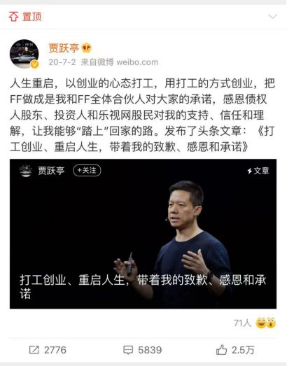 贾跃亭在微博发布致歉信