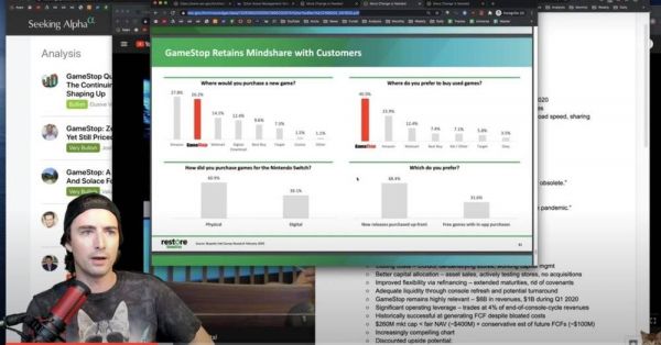 在视频中,吉尔援引题为《Restore》的研究报告,称在消费者中有26.2%的人表示将会选择游戏驿站购买新游戏,而有40%的人首选该公司购买二手游戏。他觉得该股票被重度做空,是被市场低估的投资机会。