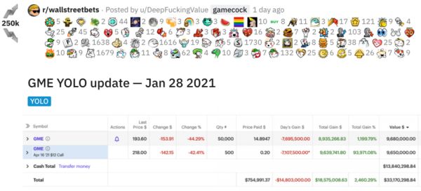 散户们的“带头大哥”是一名网名为DeepFxxkingValue(简称DFV)的“牛散”。在这个崇尚“人生只活一次(YOLO)”的选股论坛里,DFV从2019年6月开始持续不断晒出自己买入游戏驿站的看涨期权,建仓成本达5.3万美元(约合34万元人民币),点燃了其他追随者“不要怂就是干”的热情。
