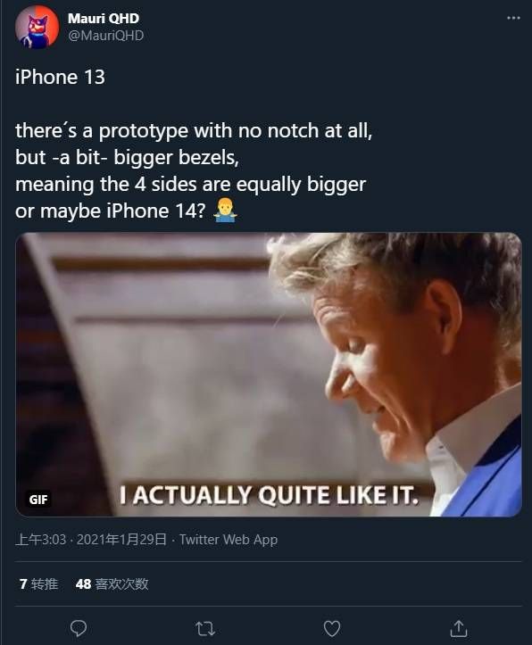 近期,海外知名爆料人士@MauriQHD表示,目前苹果在测试一款四边无刘海的iPhone原型机,但相较于以前,这款iPhone的边框“有点厚”。他推测,这可能是苹果在为iPhone 14做准备。