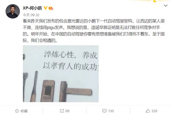 @快科技【为何与马斯克隔空互怼!何小鹏:中国企业太强 特斯拉不安】在广州车展上,小鹏汽车宣布,其下一代自动驾驶架构,将包括激光雷达技术,并成为全球首家,将激光雷达技术集成到量产汽车中的汽车制造商。消息发布后,特斯拉CEO马斯克转发了这条推文,并表示:他们有特斯拉的旧版软件,而没有我们最新的神经网络计算机。“很显然,这只是小鹏的问题,其它中国公司没有这么做。”对此,小鹏汽车董事长何小鹏肯定也是不能忍,发微博疑似隔空回应,怒怼马斯克的“抄袭说”,直言要把对方打得找不到东。