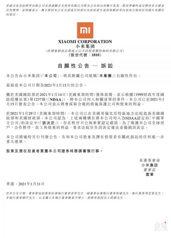 @新浪科技【小米集团:已就相关清单事件起诉美国国防部和美国财政部】小米集团公告称,公司于美国东部时间1月29日在美国哥伦比亚特区地方法院起诉美国国防部和美国财政部。本公司认为,上述两机构在将本公司列入为NDAA认定的“中国军方公司”的决定中,存在程序不公与事实认定错误,为了维护本公司全球用户、合作伙伴、员工和股东的利益,要求法院宣告该决定违法并撤销该决定。