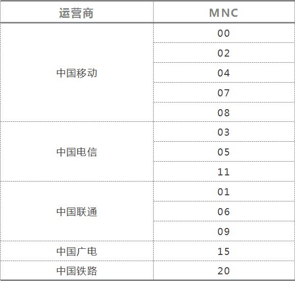 一组MCC+MNC就唯一标识了一张网络。移动国家码由三位数字组成,中国的移动国家码是460;移动网络码为两位数字,从00开始,不同运营商可能拥有多个网络码。
