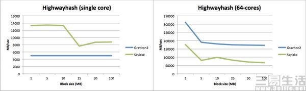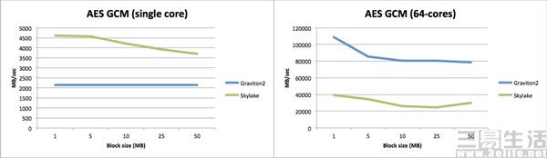 这意味着什么?在线存储服务企业MinIO的工程师Frank Wessels,曾对AWS EC2中采用Skylake-SP架构PC处理器的c5.18xlarge实例和采用Graviton 2处理器的m6g.16large实例进行了基准测试。结果显示,传统X86处理器无论是在单核还是多核实例中,均表现出随着负载加重,性能明显衰减的特征;而Graviton 2处理器却可以在单核场景下始终保持性能稳定输出,并在随后的多核场景下以数倍性能完胜X86架构的方案。