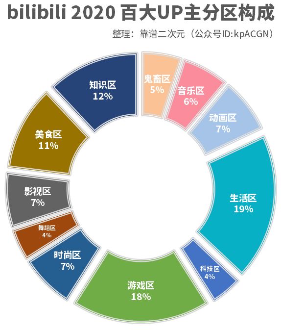 本次B站公布的2020年百大UP主,其中有26位连续三年上榜,另外有49位首次获得百大UP主殊荣的新人。靠谱编辑部(ID:kpACGN)整理发现,和2019年相比,由于新增了12名知识区UP主入选,在保持总人数不变的情况下,本次评选中游戏区、鬼畜区的获评人数减少,其中游戏区相比去年减少了7名,鬼畜区减少了5名。生活区百大UP主人数首次超过游戏区,成为了B站百大UP主占比最高的分区,而ACG(动漫、游戏)百大UP主占比仅25%,相比前两年的34%、32%有明显下降。