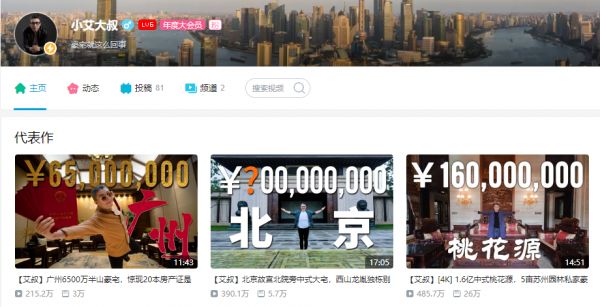 “小艾大叔”虽然并非传统意义上的“炫富”,但其在B站发布的内容大多是向网友介绍千万元甚至上亿的豪宅、豪车,以及富人们的生活,相关视频都有上百万的播放量,每次小艾大叔的视频更新,内容几乎都会登陆B站排行榜,成为热门。