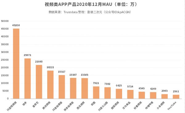 根据Trustdata大数据发布的《2020年12月移动互联网全行业排行榜》来看,目前B站12月的MAU(月活跃用户)为4249万,和B站财报Q3公布的1.97亿出现了较大的差距。或许是因为前者的统计方式并不包括B站庞大的Web端用户,但B站在移动端用户量与优爱腾甚至西瓜视频之间竟已存在数倍差距,若想弥补这些差距,仅仅通过头部UP主贡献的内容就够了吗?