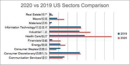 美国连续两年是三个市场中表现最为活跃的,从总需求来看,2020年比2019年增加了约30%。“Health Care/医疗”是近两年美国市场最关心的赛道,2020年受疫情的影响,该赛道专家访谈总需求量是2019年的近一倍。“Real Estate/房产”、“Materials/原料”、“Financials/金融”三个赛道需求量相对较低,但“Financials/金融”在2020年有一个比较大的增幅。