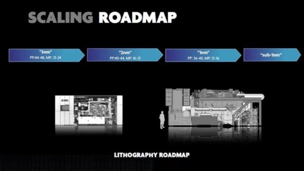 到了明年,ASML的High NA设备EXE:5000将点亮奔向1nm的道路。按摩尔第二定律,这台最新光刻机单价将是2.5亿美元。