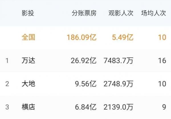 2020年,前十名院线公司的竞争格局较为稳定,万达电影、横店影视的市占率均有提升,根据华创证券统计,2020年前三大影投公司分别为万达电影、大地影院、横店影视,票房占比分别为15.3%、5.2%、4%,其中万达电影、横店影视市占率分别提升2%、0.4%。