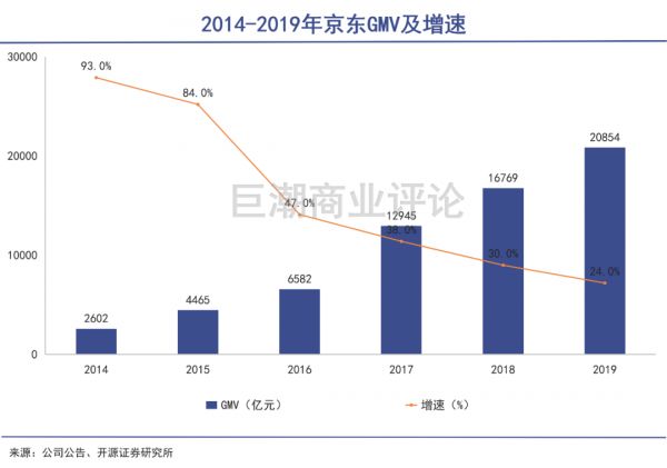 长期以亚马逊作为对标的京东(NASDAQ:JD),沿袭了自成立以来就坚持的重资产、重交易的自营风格,并将其发挥到了中国市场中的极致:到2019年,京东的交易额已经达到了20845亿之巨,并且2020年仍然在以20%左右的速度保持增长。
