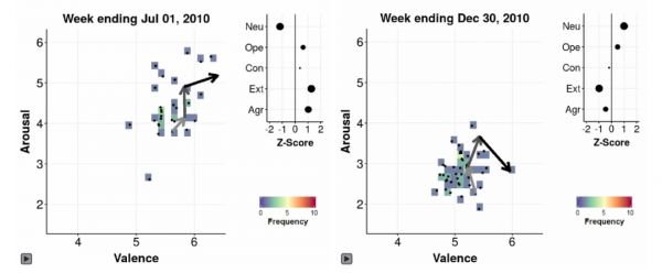 作者对用户的情绪评价进行了可视化,如下图,描述了一个女性(左)和一个男性(右)的每周情绪和唤醒波动,以及五大人格特征预测。