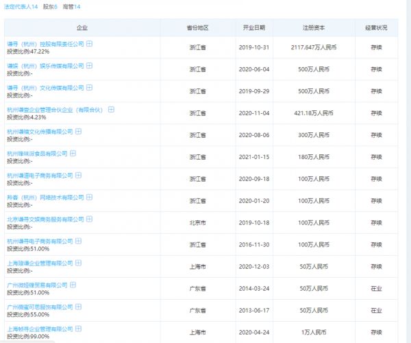 事实上,在薇娅夫妇首次出手成立创投机构之前,夫妻二人早已悄悄布局了庞大的商业版图。除了谦寻控股和杭州谦寻电子商务,董海锋还是旗下12家公司的法人,而这些公司中的大多数都集中在2019年及之后注册成立。