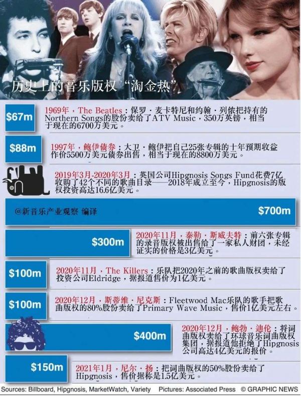 过去一年里,环球音乐版权以创纪录的价格收购了鲍勃·迪伦(Bob Dylan)所有歌曲的词曲版权,据称售价高达4亿美元;投资公司Shamrock Capital收购了泰勒·斯威夫特(Taylor Swift)前六张专辑的录音版权,据称售价超过3亿美元;Hipgnosis先后收购了尼尔·杨(Neil Young)超过1180首歌的一半词曲版权,据称售价达到1.5亿美元。