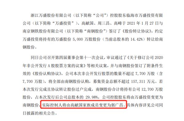 如果协议转让与定增完成,南钢股份合计将持有公司1.27亿股股份,占本次发行后公司总股本的29.98%,从而代替万盛投资成为公司控股股东。届时,郭广昌将取代高献国家族成员,成为万盛股份新的实控人。
