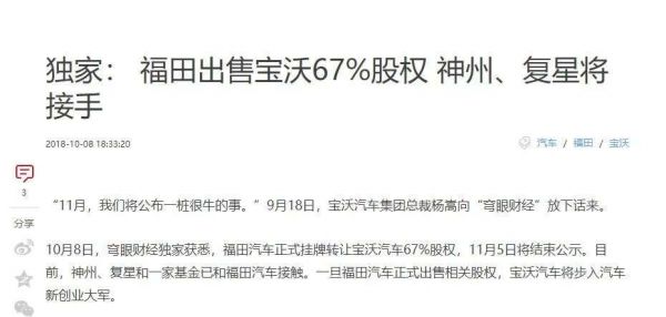此后不久,2018年10月,福田汽车挂牌转让宝沃汽车67%股权。当时也曾传出复星与福田汽车接触的消息,但是,这一次同样存在恒大、神州优车、五矿集团等竞争对手。最终,福田汽车选中了神州优车,复星又一次落空。