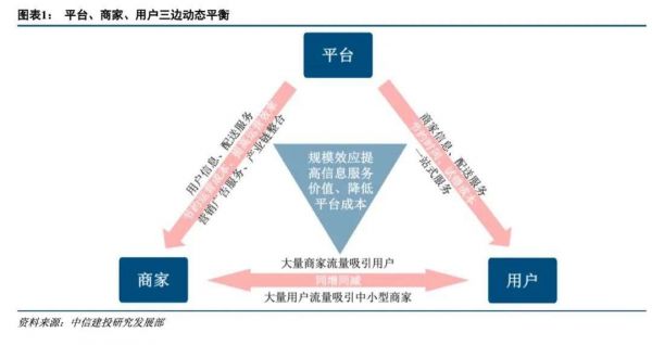 如上图,商家增长驱动用户增长,用户增长再拉动商家增长。平台通过配送、信息等服务,与用户、商家共同架设其铁三角后,再把触手伸到更多的领域,比如图书、教育。