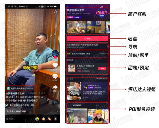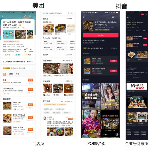 美团是将商户所有的信息聚合到一个页面中,而抖音却把商户相关的内容拆分成两个部分,分别是POI聚合页和企业号商家页面。
