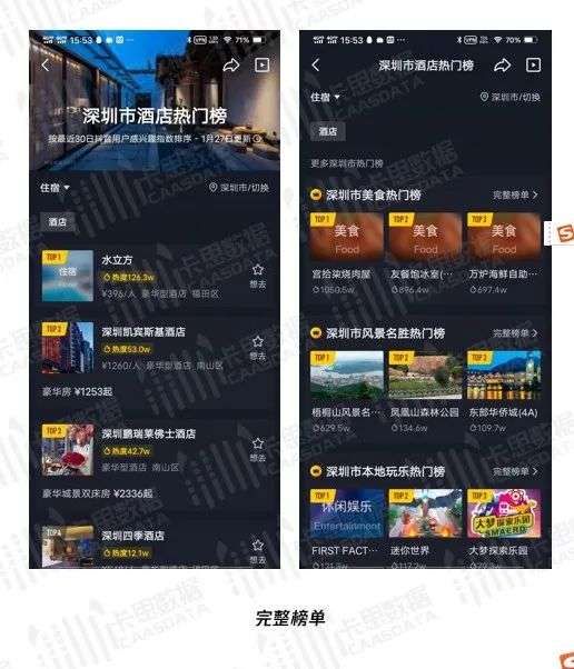 值得注意的是,通过搜索到达的“城市聚合页”与通过视频到达的“城市聚合页”,展示规则并不相同,在搜索聚合页中,视频以专题合集的形式进行展示。也就是说,搜索更偏向于推荐“生活方式”,而视频更偏向于推荐具体的“生活服务”,这与用户是主动搜索信息还是被动接受信息有很大的关系。但两种方式,有一个的地方是相同的,就是会指向“城市榜单”。