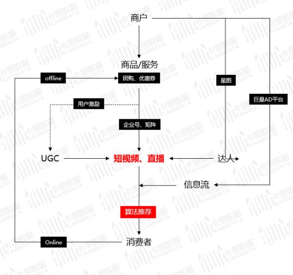 而抖音不同,抖音的基本盘是内容。商户、达人、UGC共同为商品/服务创造内容,内容再经由算法,基于兴趣精准的推向用户。最终,用户完成从线上到线下的消费体验。