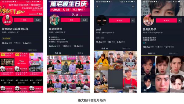而创作段子类视频严格意义上来说,是一种营销、炒作行为,对于更强调“评价、口碑”的本地生活行业来说,仅凭企业号去做这个事情是远远不够的,矩阵账号才是应有的玩法,比如:董大厨 这样的高段位玩家。
