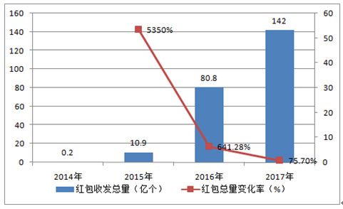 数据统计显示,2017年中国除夕收发红包总量为142亿个,较上一年增长了75.7%,又一次创下红包收发总量的新纪录,不过整体收发红包总量增速呈明显下降趋势。