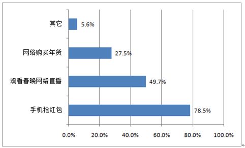 尽管收发红包总量增速降低,但红包活动在老百姓的春节活动比例中却一再扩大。在2017年春节期间,78.5%中国手机网民参与手机抢红包活动,49.7%手机网民在春节期间使用网络观看春晚直播,27.5%网民利用网络购买年货。