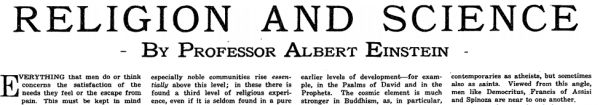 爱因斯坦的一生中有很多金句,其中反复出现过“宗教”和“上帝”这些词汇。1930年,在写给《纽约时代杂志》的文章“科学与宗教”中,爱因斯坦定义了“宇宙宗教体验”(cosmic religious sense)和“宇宙宗教经验”(cosmic religious experience)并进行了系统的论述。