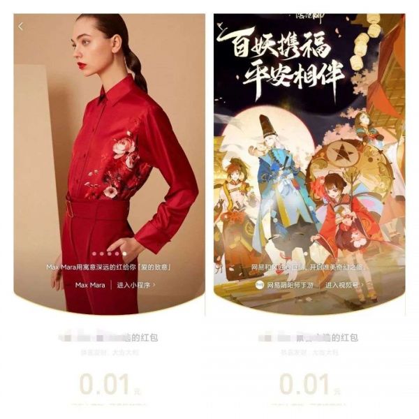 在一个完整的定制封面中,包括发红包页、红包消息气泡、拆红包页、红包详情页四种展现形式,定制方可以将自己的 logo、主题色等元素融入设计中,封面图案可以是具体的商品,也可以是明星人物。封面故事则是更完整的品牌展示,可以加图片、视频、文字等内容。一个红包封面就像是一个品牌的橱窗展示,基本框架已经搭好,只看你如何运用创意添加内容。