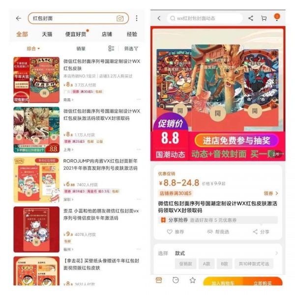 红包封面的玩法明显是有利可图的,也的确有人直接在一些平台进行售卖。定制方需要付出设计成本,和 1 元一个(100 元起订)的定制费用,如果是一些热门 IP、网络梗图、明星定制的封面,很多人愿意花钱去买,价格在 2-10 元不等。虽然微信官方限制不允许售卖封面,且封面有效期只有 3 个月。但赶上春节这样的红包频发时期,加上不贵的价格,还是有人愿打愿挨。
