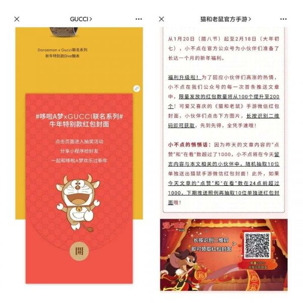 红包封面的发放方式有二维码、序列号、链接,品牌通常在社交媒体引导关注和互动,在你和红包封面间设立重重「阻碍」。猫和老鼠手游在每天推文下送限量封面,想得到就要定时蹲守,品牌还可以借此建立社群,进一步设立规则加强互动;Gucci 的哆啦 A 梦封面就更为复杂,要到小程序注册会员,或者在朋友圈广告里抽;还有配合抽奖小程序的...... 总之红包有限,不管你最终是否得到,已经不知不觉中关注了一堆账号/注册了一堆会员,至少造成了一次点击。