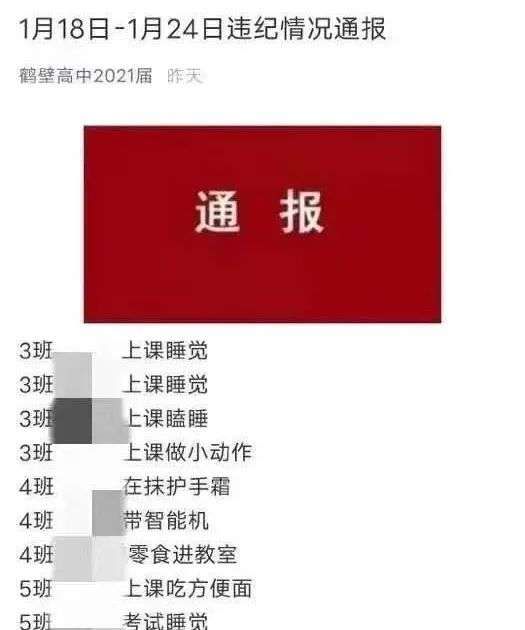 1月28日,一份河南鹤壁高中“违纪情况通报”在社交平台流传并引发巨大争议。该通报公布的是学校高三年级学生1月18日-1月24日的违纪情况,内容这样写到:3班XXX上课睡觉、4班XXX在抹护手霜、5班XXX考试睡觉、7班XXX向别人传爆米花……