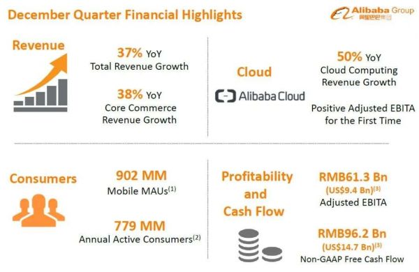 阿里巴巴于2021年2月2日晚公布了上一季度(2020年10-12月)的财报:营业收入同比增长37%(其中核心电商收入增长38%),经营利润同比增长24%,扣非净利润同比增长27%——主要指标均超过了分析师一致预期。