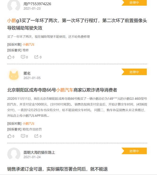 可是对于造一辆车来说,小鹏汽车似乎总感觉缺了点什么。我们在黑猫投诉上以“小鹏汽车”为关键词进行搜索,发现存在辅助失效、虚假宣传、定金难退等多起投诉。