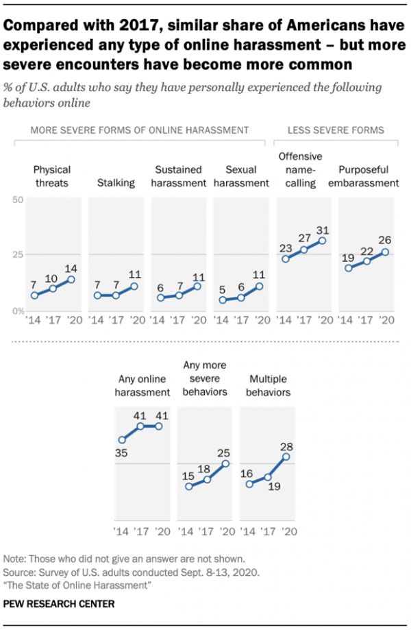 研究还发现,41%的美国人表示自己曾经历过某种类型的在线骚扰,遭遇过严重骚扰事件的人数比例也从2014年的15%增长至2020年的25%。各种类型的骚扰事件日益频繁,在网络上受到言语辱骂、性骚扰、恶意中伤和人身威胁的人数自2014年以来均有所增加。经历过轻度骚扰行为的人数比例则与2017年基本持平,维持在37%左右。
