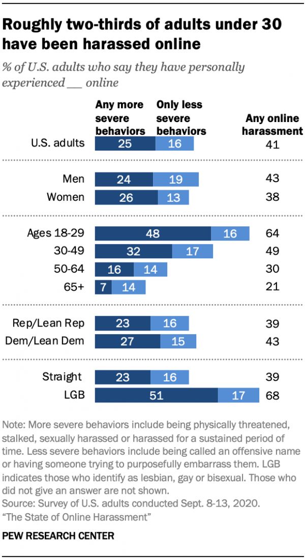 近三分之二的30岁以下成年人受到在线骚扰,且尤其受到言语辱骂、跟踪、人身威胁、性骚扰、长期骚扰等程度严重的骚扰