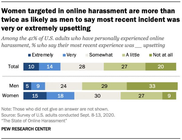 此外,虽男性普遍比女性更频繁遭遇网络骚扰,但女性更容易在情绪上受到骚扰事件的影响。研究显示,因最近一次受骚扰事件而感到内心极度受挫的女性比例达34%,是男性的两倍之多。相反,61%的男性表示最近一次被骚扰经历并未给自己带来多大影响。