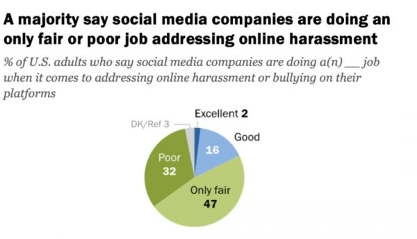 公众也对社交媒体当前的表现持批判态度。皮尤报告显示,仅18%的受访者认为社交媒体在解决骚扰问题方面表现优异或良好,近80%的人认为各平台表现平平,甚至到了糟糕的程度。