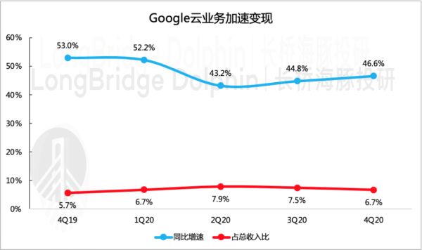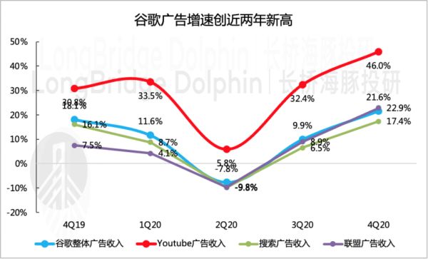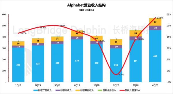 除此之外,线上经济的加速渗透也使得Alphabet在其中大大受益,谷歌云、Youtube是本次业绩成绩单中最亮眼的“科目”,增速非常可观。