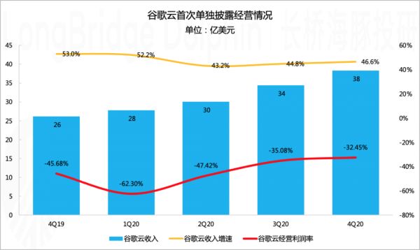 Q4财报首次将云业务的经营情况从Google业务中单列出来呈现,表现公司对云业务的高度重视。Q4谷歌云业务实现收入38亿美元,同比增速47%,经营利润仍未转正,但较Q3亏损率继续有所下滑。